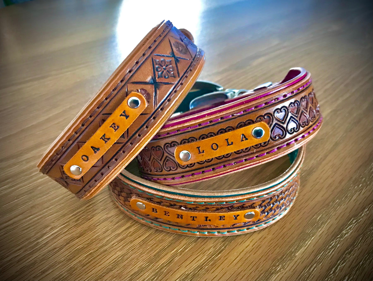 Custom leather dog collars made to order from premium vegetable tanned leather.