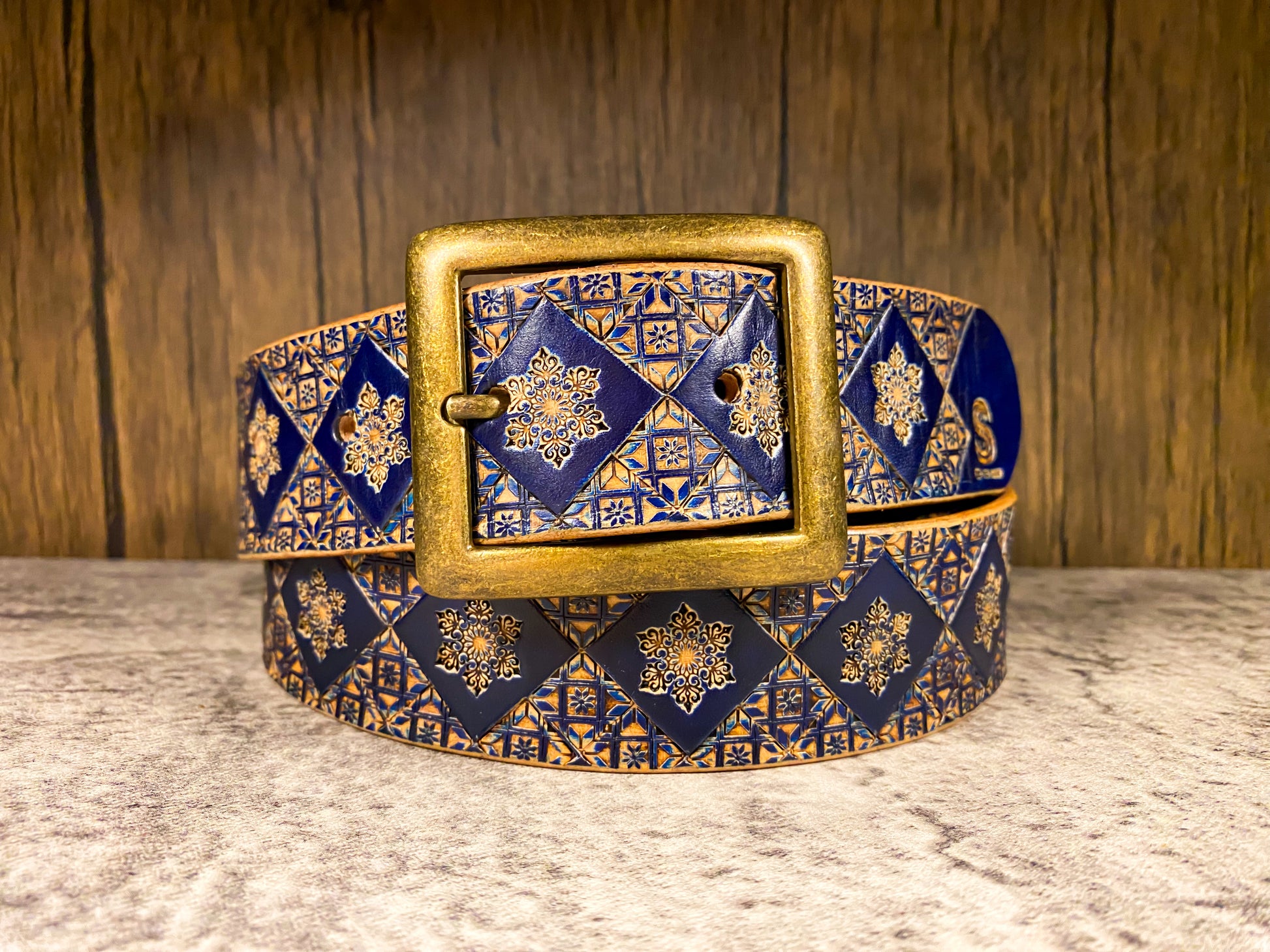 Inspired by the tranquil beauty of winter, the Blue Ice design features intricate motifs of snowflakes and ice crystals. Hand-tooled with precision, this pattern captures the elegance of frosty landscapes, paired with a cool, icy blue hue.